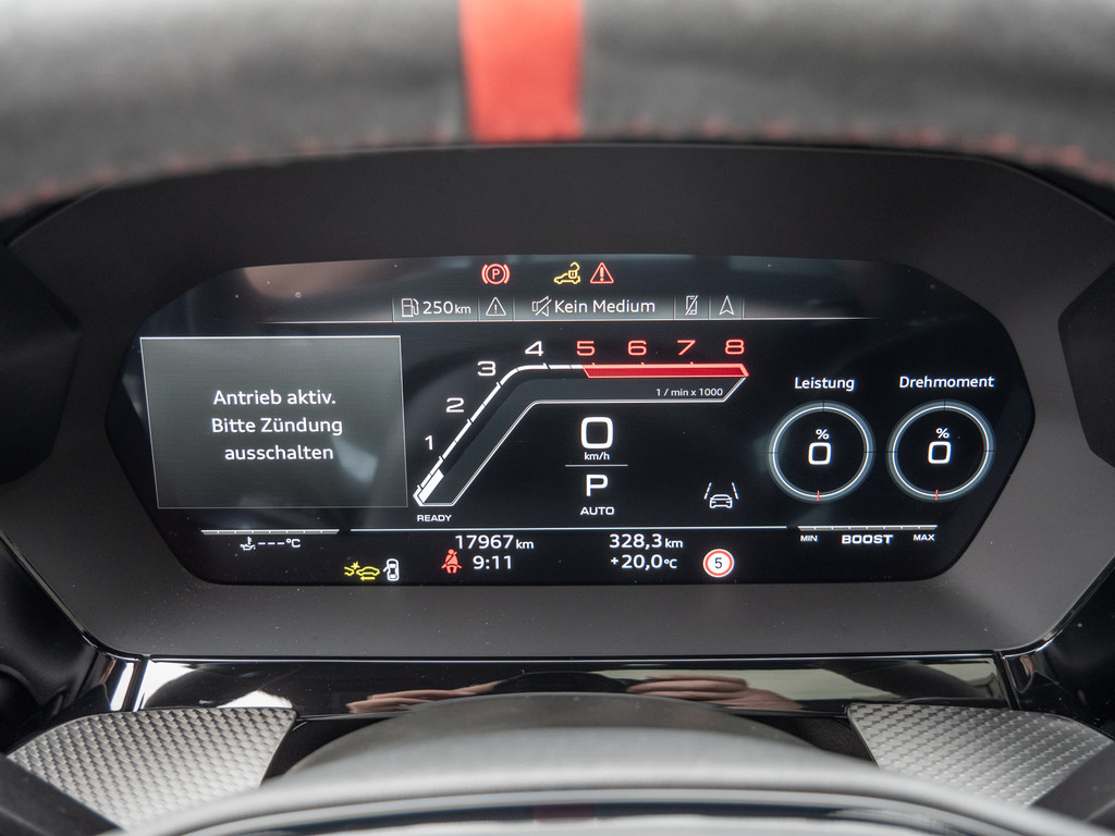 Proaktiver Insassenschutz Front, Seite und Heck, Ledervariante 7, N.N.N. Ausfuehrung 4, Assistenzpaket Schutz- und Warnsysteme plus, RS-Exterieurumfaenge Carbon/schwarz glaenzend, Heckklappenspoiler Carbon, Komfortpaket pro, Adaptiver Geschwindigkeitsassistent ohne Geschwindigkeitsbegrenzer, Interieurelemente unten Mikrofaser Dinamica schwarz, Komfortoeffnung Gepaeckraumklappe, LTE-Unterstuetzung fuer Audi phone box, Dekoreinlage und Akzentflaechen Carbon Atlas matt, Assistenzpaket Fahren und Parken pro und Assistenzpaket Schutz- und Warnsysteme plus, Stossfaenger, Interieurapplikationen Vanadiumoptik, 7-Gang-Automatikgetriebe fuer Allrad, Reifen performanceoptimiert 265/30|245/35 R19, Datenmodul Europa