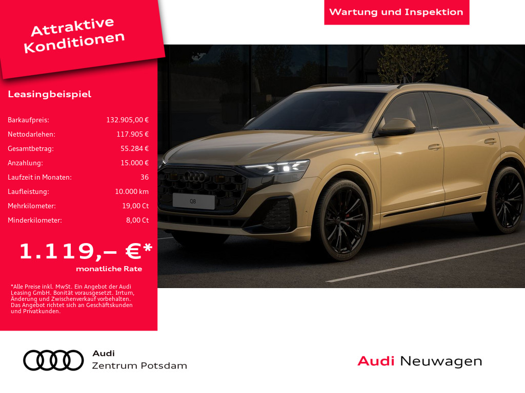 *Ein unverbindliches Leasingangebot der Audi Leasing GmbH, Gifhorner Straße 57, 38112 Braunschweig. Das Angebot richtet sich an Einzelabnehmer. Alle Preise inkl. 19% Mehrwertsteuer. Fahrzeugpreis: 132.905,00 EUR, Nettodarlehensbetrag: 117.905,00 EUR, Einmalige Leasingsonderzahlung: 15.000,00 EUR, Laufzeit: 36 Monate, Laufleistung p.a.: 10.000 km, monatliche Leasingrate: 1.119,00 EUR, Sollzins p.a.: 4,08%, effektiver Jahreszins: 4,08%, Gesamtbetrag: 55.284,00 EUR (Summe aus Leasingsonderzahlung und monatlichen Leasingraten), Minderkilometer: 7,85 Cent/km, Mehrkilometer: 19,16 Cent/km, Freigrenze: 2.500 km.