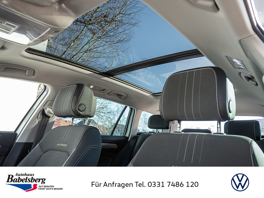 Vorbereitet fuer "We Connect" und "We Connect Plus" oder "VW Connect" und "VW Connect Plus", Schalthebelknauf in Leder, Notruf-Service, Laufzeit 10 Jahre ab Erstauslieferung, Voraussetzung: Verfuegbarkeit benoetigter Mobilfunknetze, Sitzmittelbahnen der Vordersitze und der aeusseren Ruecksitzplaetze in Stoff "Alltrack", LED-Leuchte im Fussraum vorn, Kraftstofftank mit 66 l Fassungsvermoegen, Alltrack