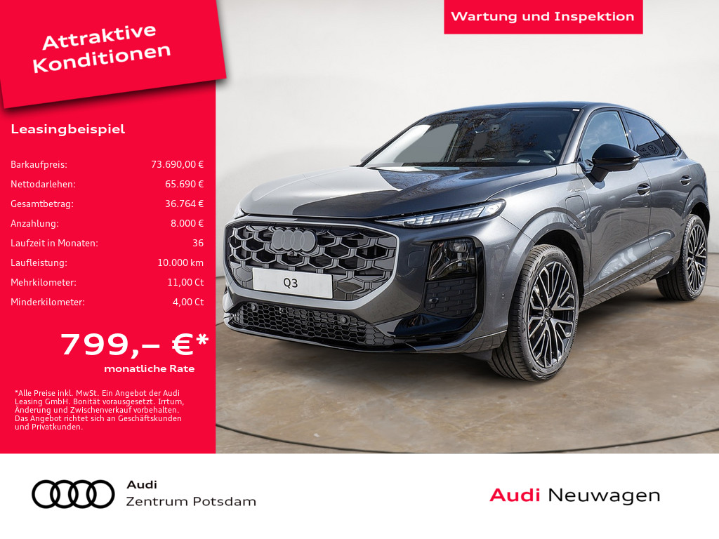 *Ein unverbindliches Leasingangebot der Audi Leasing GmbH, Gifhorner Straße 57, 38112 Braunschweig. Das Angebot richtet sich an Privatkunden und Geschäftskunden. Alle Preise inkl. 19% Mehrwertsteuer. Fahrzeugpreis: 73.690,00 EUR, Nettodarlehensbetrag: 65.690,00 EUR, Einmalige Leasingsonderzahlung: 8.000,00 EUR, Laufzeit: 36 Monate, Laufleistung p.a.: 10.000 km, monatliche Leasingrate: 799,00 EUR, Sollzins p.a.: 5,25%, effektiver Jahreszins: 5,25%, Gesamtbetrag: 36.764,00 EUR (Summe aus Leasingsonderzahlung und monatlichen Leasingraten), Minderkilometer: 4,17 Cent/km, Mehrkilometer: 11,42 Cent/km, Freigrenze: 2.500 km.